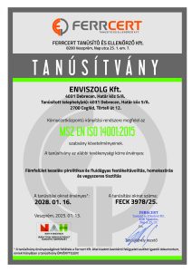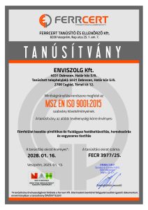 Az ISO 14001 Környezetközpontú Irányítási Rendszer a környezetvédelem iránti elkötelezettséget és a jogszabályi megfelelőséget tükrözi azon vállalatunknál. Ez biztosítja azt is, hogy a munkatársak, a dolgozók környezettudatosabbá válnak, így nem csupán a szervezet filozófiája, de munkavégzése is nagyobb fokú bizalmat kelt a közvélemény irányába.